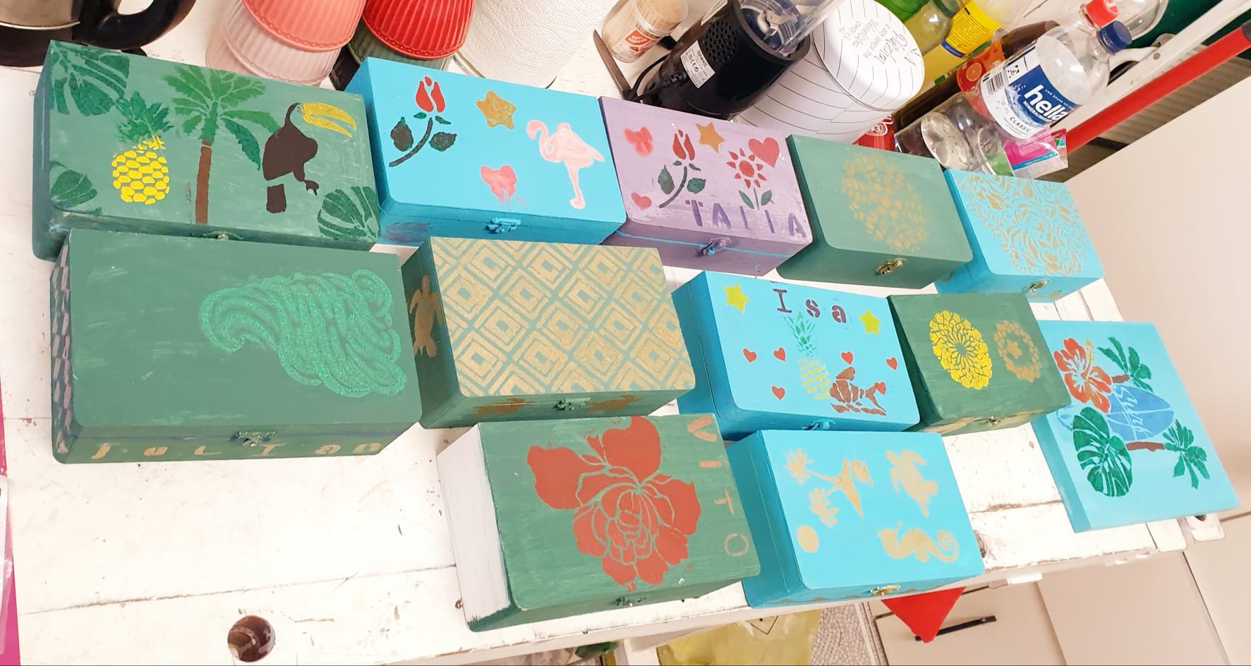 Mit unterschiedlichen Kreidefarben, verschiedenen Schablonen, bunten Dekosteinen, Schleifpapier und Wachs werden Holzbretter oder Holzkisten gestaltet. Dabei sind der Fantasie keine Grenzen gesetzt.